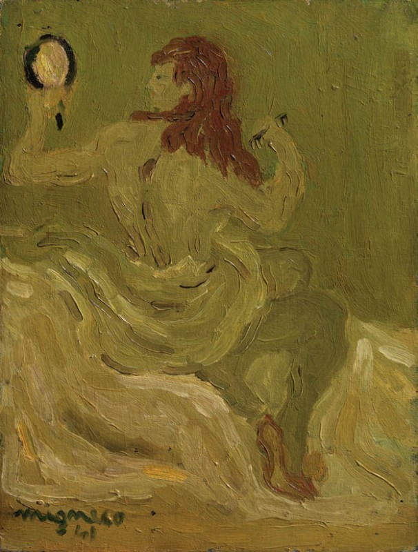 Giuseppe Migneco Messina 1908 - Milano 1997 Donna allo specchio, 1941 Olio su cartone telato, cm. 39,7x29,5 Firma e data in basso a sinistra: Migneco / 41. Al verso: cartiglio Mostra Sindacato Belle Arti / di Firenze. Sezione di Milano.