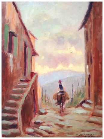 PIERO SEMERARO Trieste 1914 - Pisa 1998 Tramonto in montagna 1957 Olio su tavola 40 x 29,8. Firma in b. a d.; sul verso firma, data e titolo. Base d'asta: 100