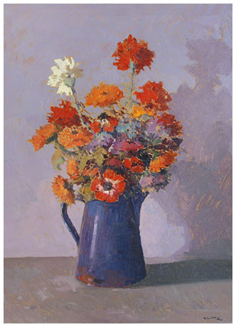 ANGIOLO VOLPE Livorno 1943 Composizione fiori Olio su cartone 67,7 x 47,5. Firma in b. a d.; sul verso titolo e firma. Base d'asta: 250