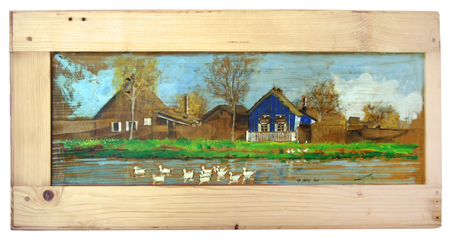 MASSIMO LOMI Livorno 1953 La dacia blu 2014 Tempera su tavola 43 x 90. Titolo e firma in b. a d.; sul verso etichetta e timbro studio dell’artista + etichetta mostra “Massimo Lomi – Le terre di Toscana”, Fortezza di Montalcino (Siena) 27 settembre - 26 ottobre 2014. Base d'asta: € 290