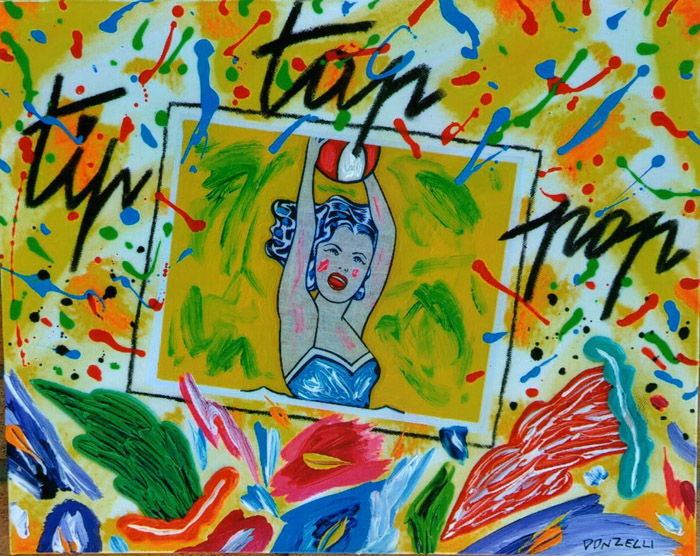Bruno Donzelli "Tip, tap, pop" olio, acrilici e smalti su tela cm 40x50 Firma...