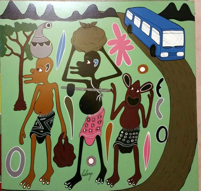 George Lilanga "Villaggio La corriera" smalti su masonite cm 61x61 Certificato CPT Felix
