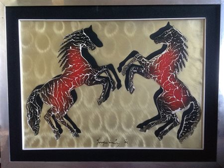Sage Vernis "Cavalli" 1974 smalti su lamiera cm 50x70 firma e data in basso al centro, autentica sul retro del maestro. In cornice d'alluminio con pass