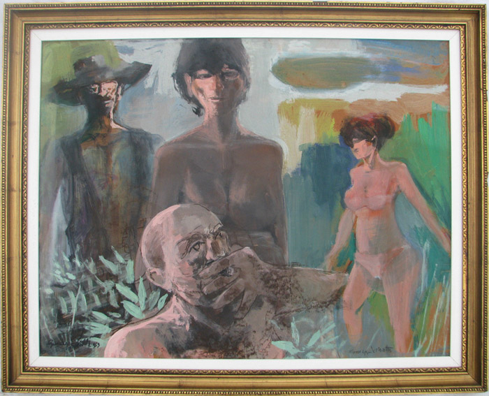 Giuseppe Motti ,Figure sul Po" 1963 olio su tavola cm 60x90.Aut.Su foto Galleria Sforzini Arte