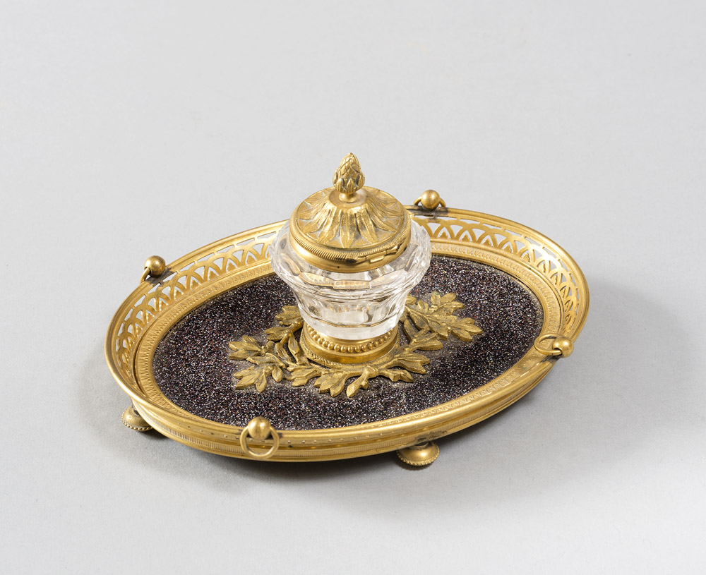 CALAMAIO RUSSO di forma ovale con piano in metallo smaltato ad imitazione del granito rosso, bordo bronzo dorato e traforato con disegno a cestino, al centro ramages con foglie con porta inchiostro in cristallo con coperchio in bronzo dorato con piccola