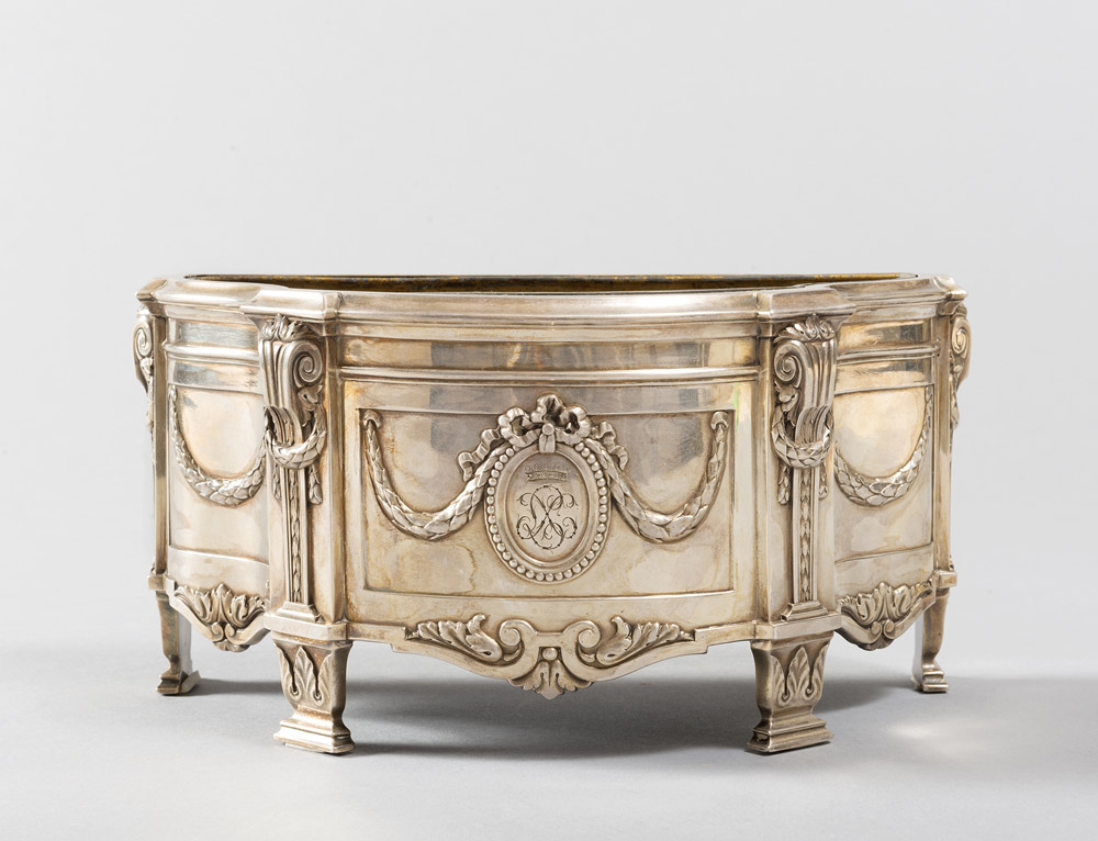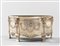 PORTAFIORI IN ARGENTO IN MINIATURA a forma di comò con fronte e lati mossi ad esse decori a festoni in bassorilievo Punzonato A. Risler & Carrè, Paris, altro punzone con testa di donna.al retro sotto il bordo Fine XIX secolo Misure cm 13 x 24 x 11 P