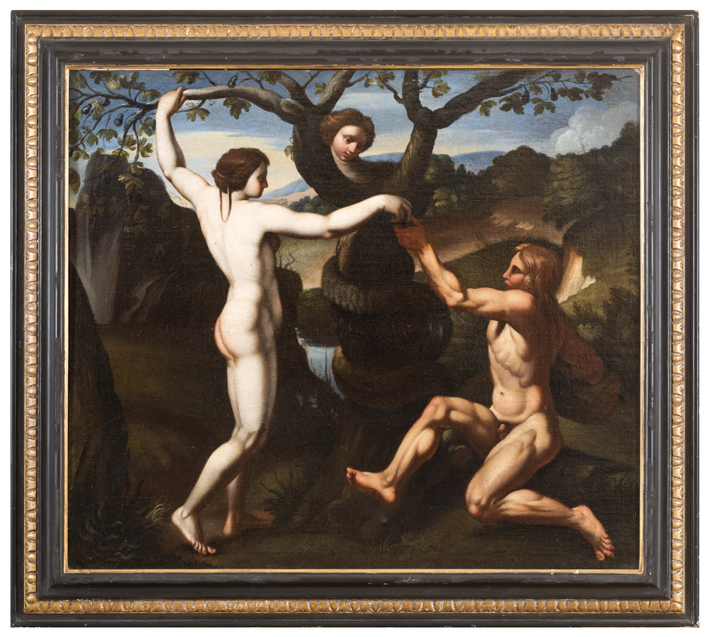 PITTORE ITALIANO INIZI XVII SECOLO Adamo ed Eva Olio su tela cm 85 x 74 Condizioni del dipinto Buon restauro, non ci sono danni evidenti, chiusura evidente del craquele. Punti di restauro sparsi, Il volto di Eva presenta vari punti di ripristino
