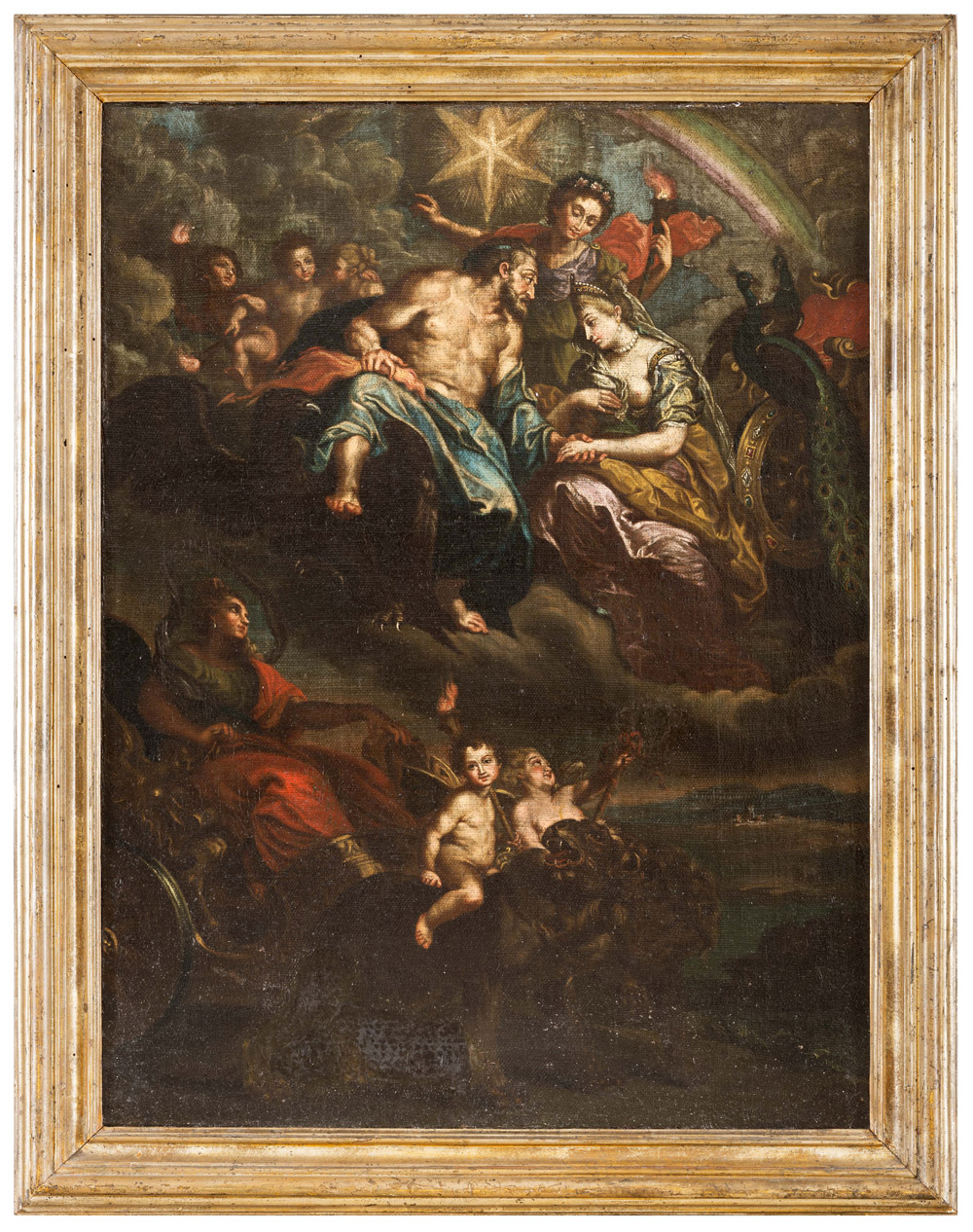 COPIA DA RUBENS XVII SECOLO Enrico IV disarmato dal fuoco dell'amore chiede in sposa Maria de Medici Olio su tela cm 74 x 52 Vecchio rintelo Etichetta 'disindestato il 18.10.1962' al retro. Tela a maglia larga. Necessità di pulizia generale, specie