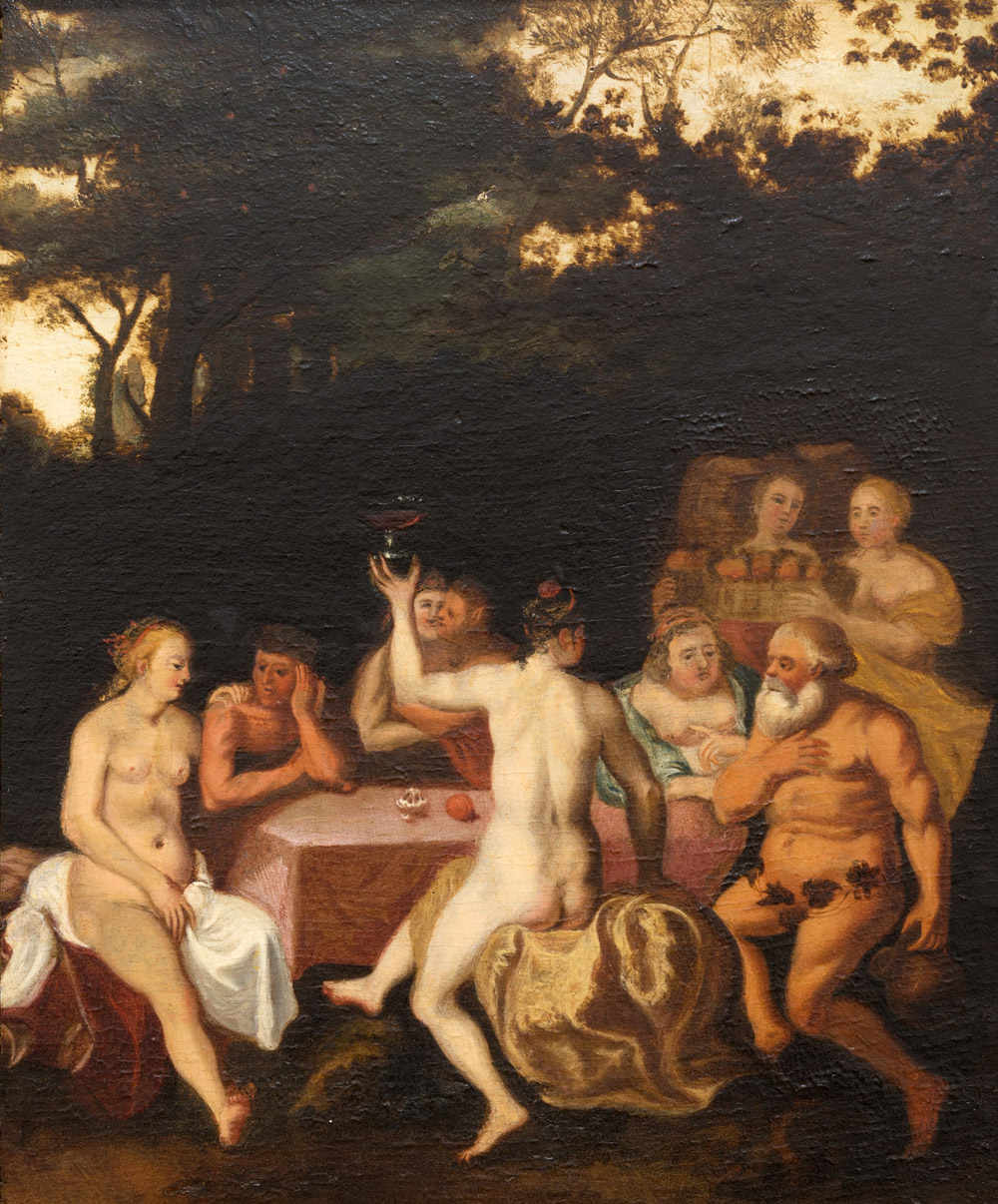 CORNELIS VAN HAARLEM Att.a. Haarlem 1562 - 1638 Baccanale Olio su tavola cm 31,5 x 21,6 Condizioni del dipinto Discrete condizioni della parte pittorica con piccoli punti di restauro sulla schiena della donna e sulla vegetazione.