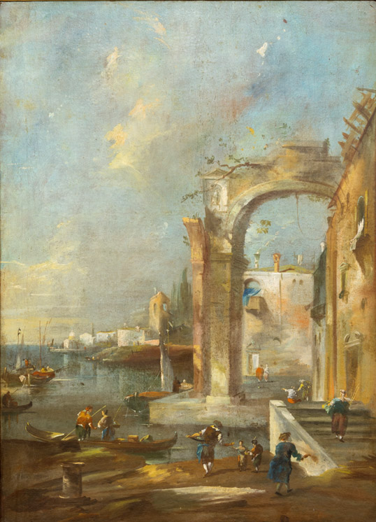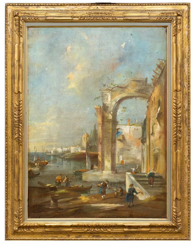 PITTORE VENETO XVIII SECOLO Scorcio di Venezia con figure Olio su tela cm 125 x 90 Cornice in legno dorato e intagliato in bassorilievo, Venezia fine XVIII secolo Condizioni del dipinto Vecchio rintelo, vecchio punti di restauro sparsi ormai cristal