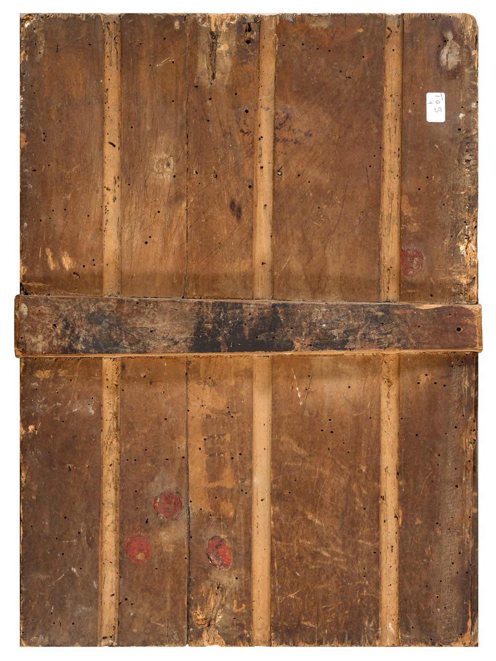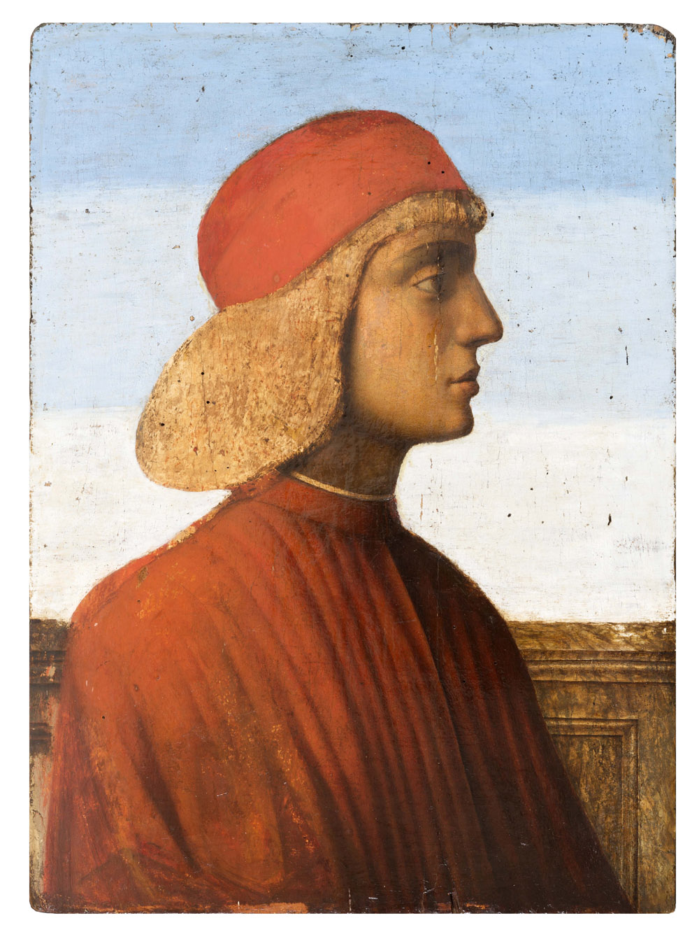 PITTORE ITALIANO XV SECOLO Profilo di uomo con tunica rossa Olio su tavola cm 58,5 x 43 Opera probabilmente non portata a termine Condizioni del dipinto La tavola in legno si presenta in due parti, cm 27,5 e cm 15,5 in discrete condizioni Sono prese