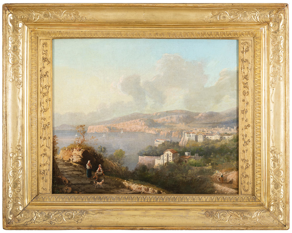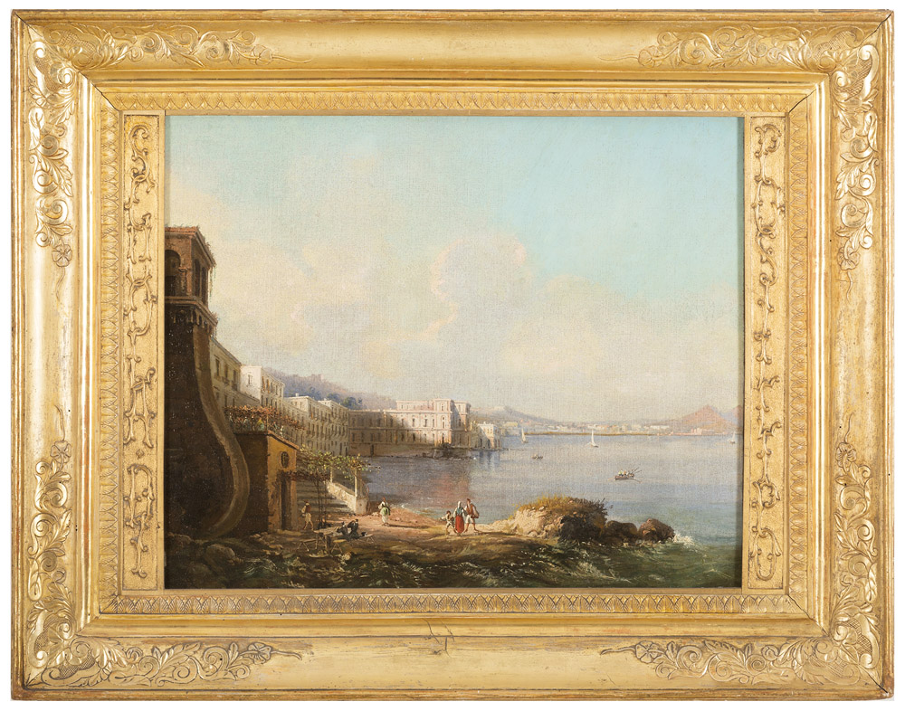 SCUOLA DI POSILLIPO PRIMA META' XIX SECOLO Costiera Amalfitana Lungomare Napoli Coppia di oli su tela cm 62 x 51 Cornici dorate con decoro in bassorilievo. Fregi laterali con intaliagliate in bassorilievo con scritta "Scuola di Posillipo" Condizioni