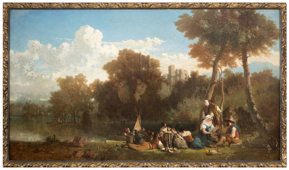 PITTORE ITALIANIZZANTE INIZI XIX SECOLO Famiglia con donna che medica uomo in paesasggio con lago e castello diroccato Olio su tela cm 100 x 178 Provenienza Weitzel Gallery, New York.Timbro al retro