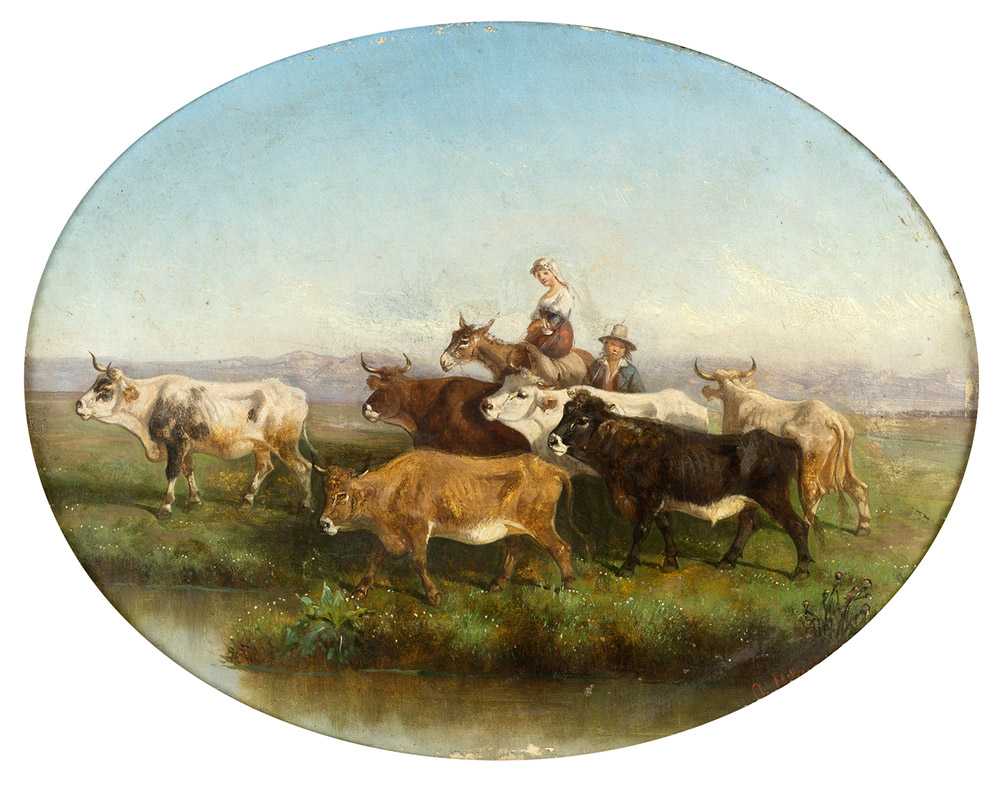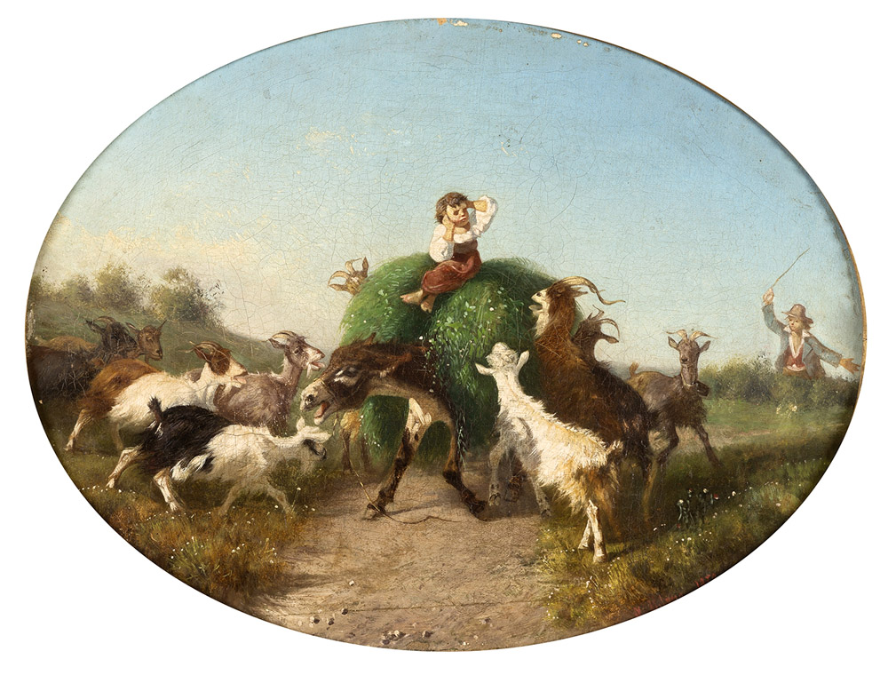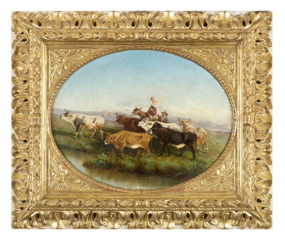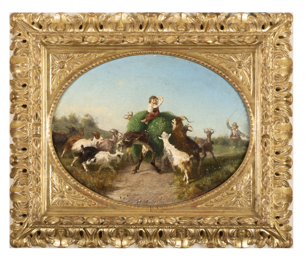 ANTONIO MILONE Napoli 1843 - 1920 La bambina e le caprette, 1870 Al pascolo Coppia di su tela ovale cm Firma in basso a destra Cornici intagliate e dorate Il dipinto la bambina è ripreso da un dipinto di Giuseppe Palizzi