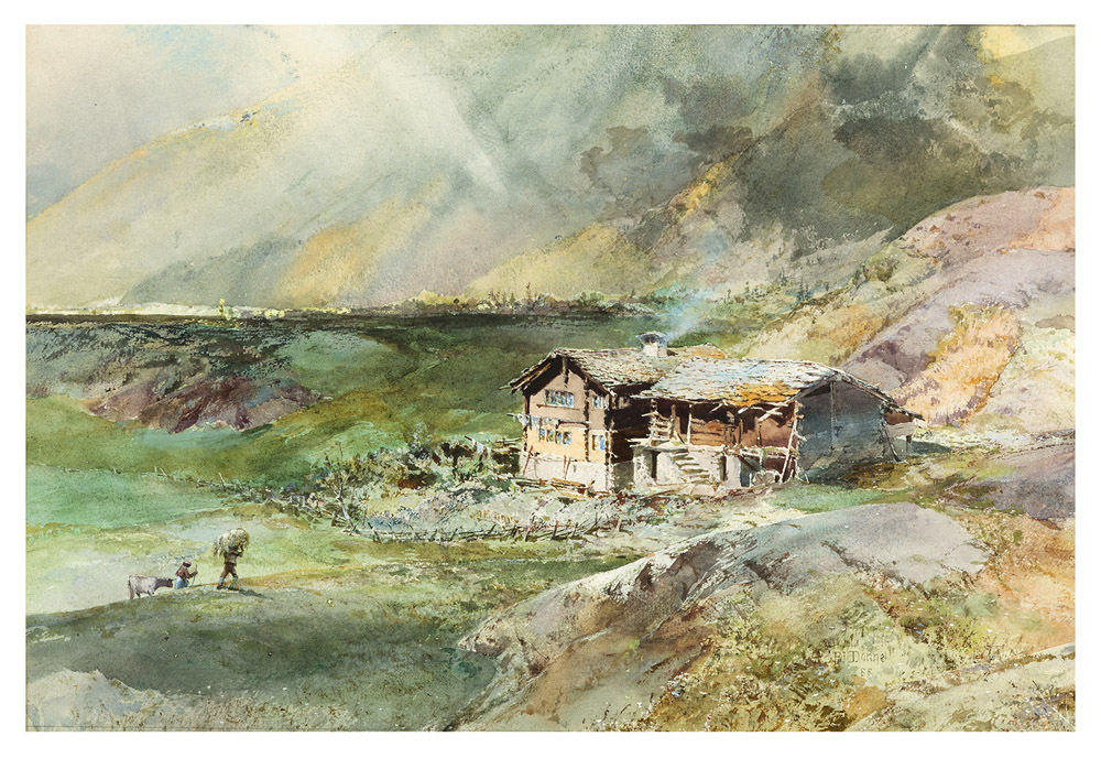 BENJAMIN J.M. DONNE Svizzera 1831 - 1928 Chalets near Saas Fee, 1888 Acquerello su carta cm 27 x 40 Firma e data in basso a destra Stima € 200 - 250