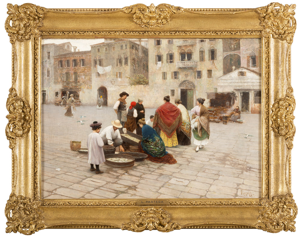 LUIGI PASTEGA Venezia 1858 - 1927 Fruttivendole a Venezia Olio su tela cm 42 x 57 Firma in basso a destra