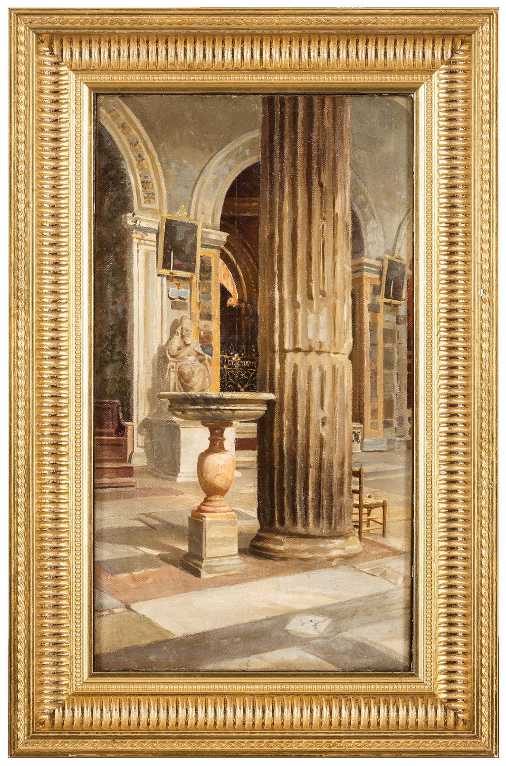 SALVATORE MARCHESE Parma 1852 - 1926 Interno di chiesa con fonte battesimale e colonna romana, 1880 Olio su tela cm 46 x 25 Firma e data al retro