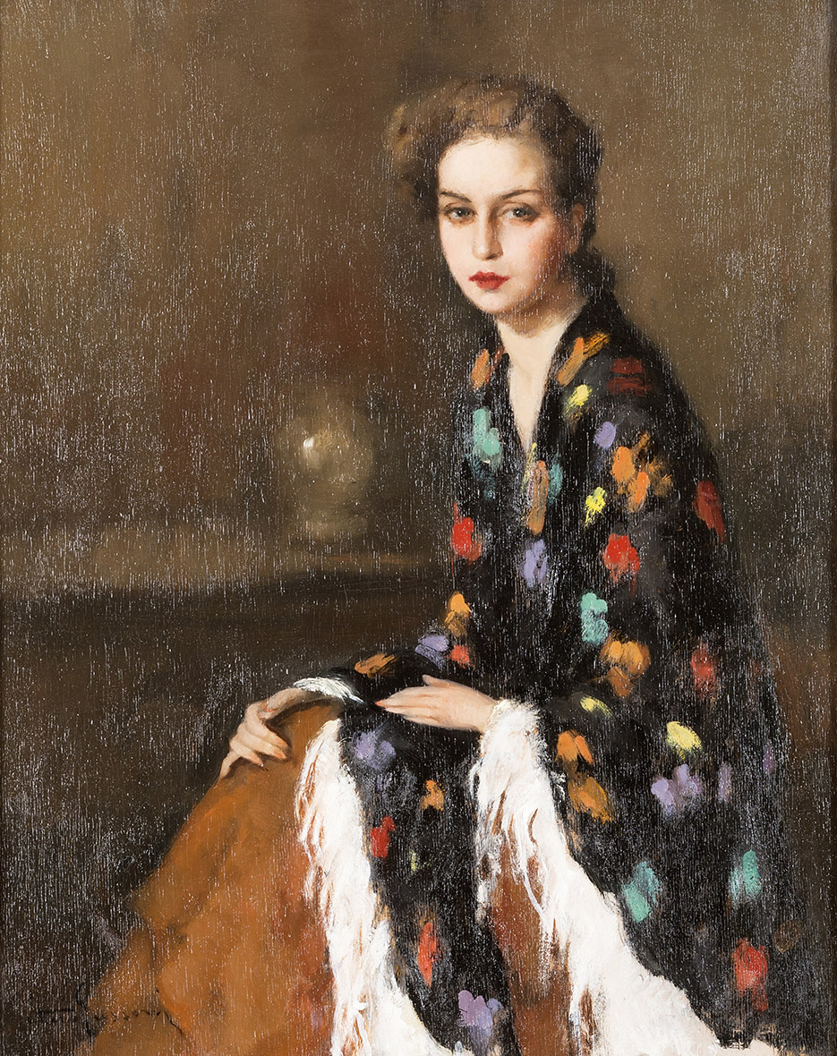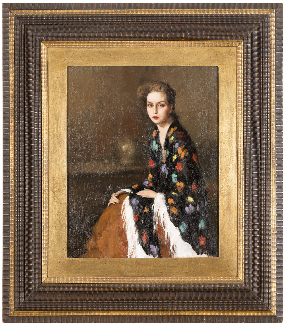 VITTORIO GUSSONI Milano 1893 - San Remo 1968 donna con scialle Olio su tavoletta cm 50 x 40 Firma in basso a sinistra