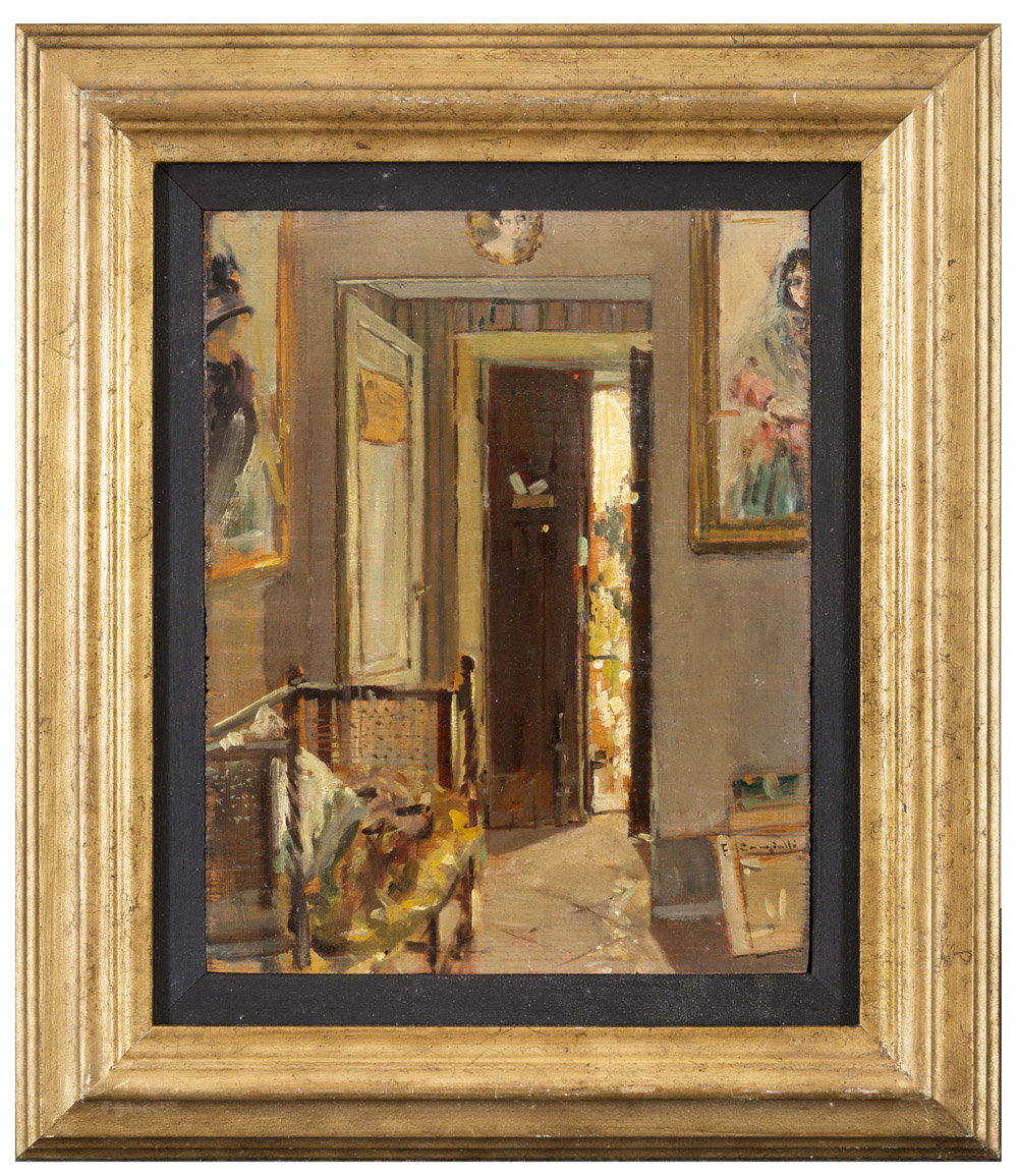 FRANCESCO CANGIULLO Napoli 1884 - Livorno 1977 Ingresso di casa Olio su tavola cm 22,7 x 17,7 Firma in basso a destra