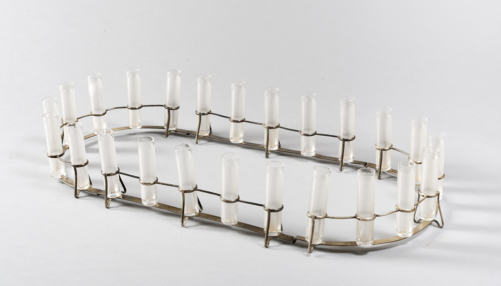 Lotto 78 | CENTRO TAVOLA porta fiori modulare in metallo argentato con 24 solifleur a...