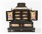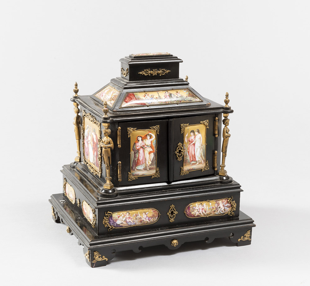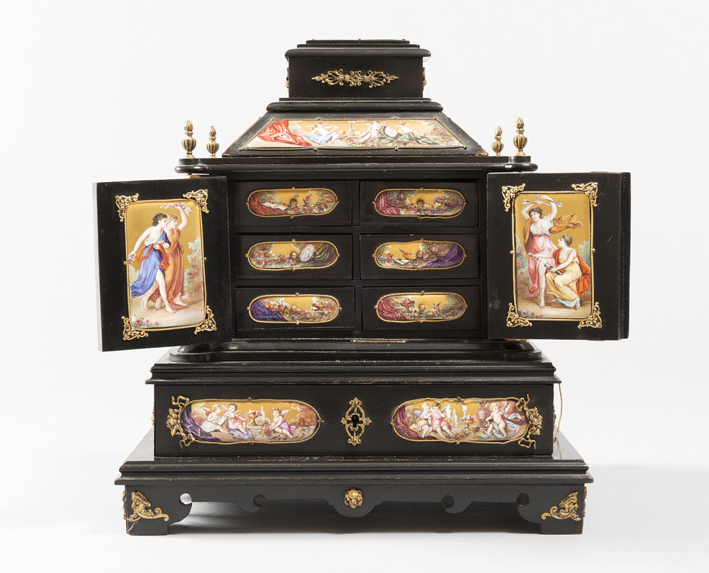 PORTA GIOIE in legno tinto ad ebano a forma di monetiere con facciate centrate da rametti dipinti a smalti policromi con raffigurazione di donne e amorini. Parte centrale con piccole erme laterali in bronzo dorato con fronte a due sportelli celanti all