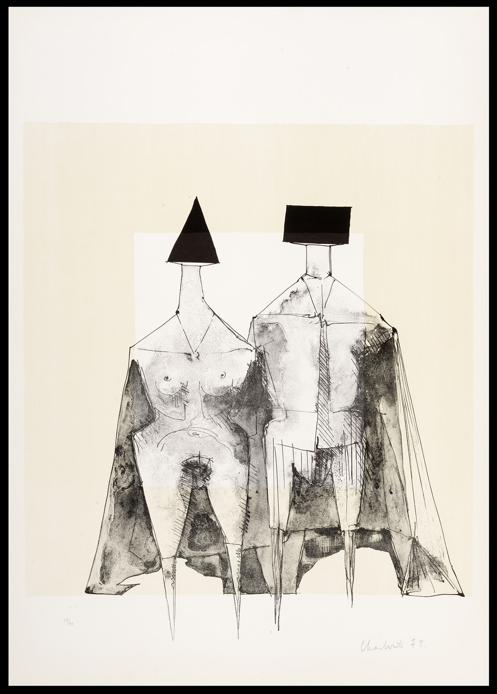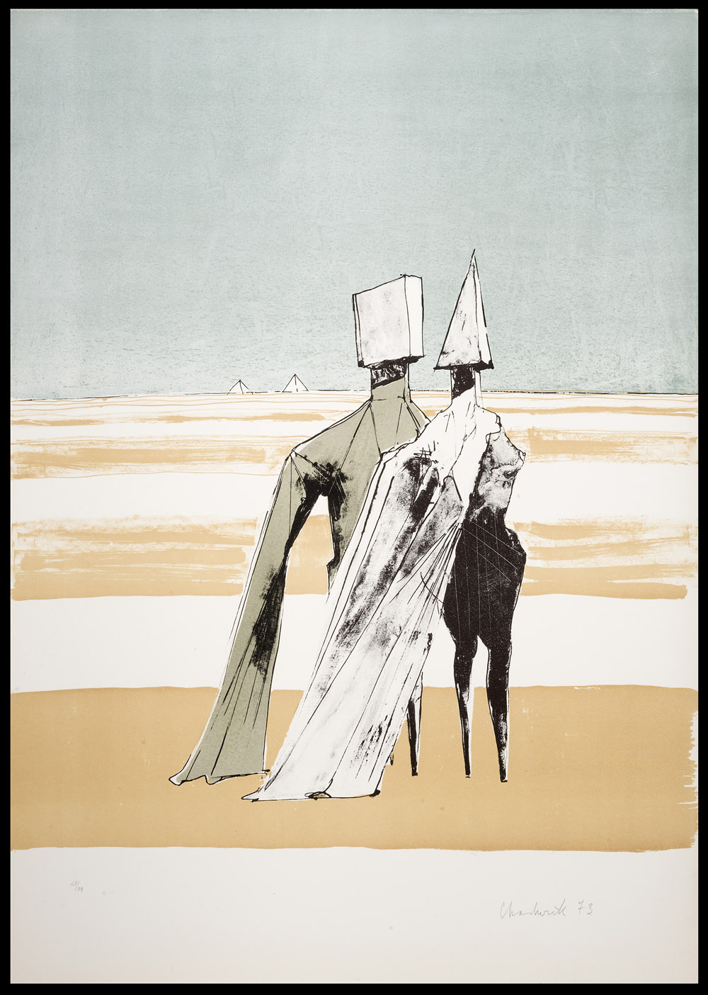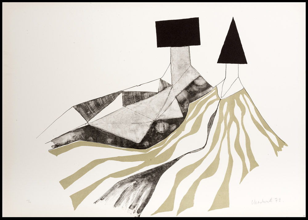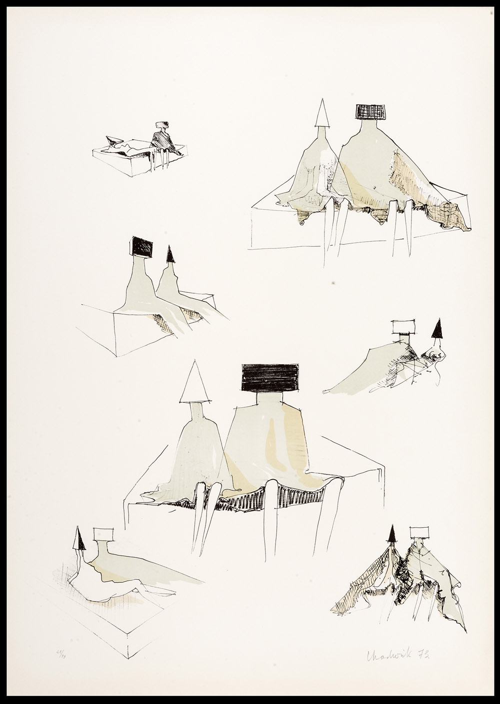 LYNN CHADWICK Barnes Londra 1914- , Lypiatt Park 2003 Standing figures, 1973 Sketches for sitting figures, 1973 Standing figures with piramidis, 1973 Reclining couple, 1973 Quattro litografie, ex. 48/99 Misure del foglio cm 70,5 x 50,3 e una cm 50,3 x