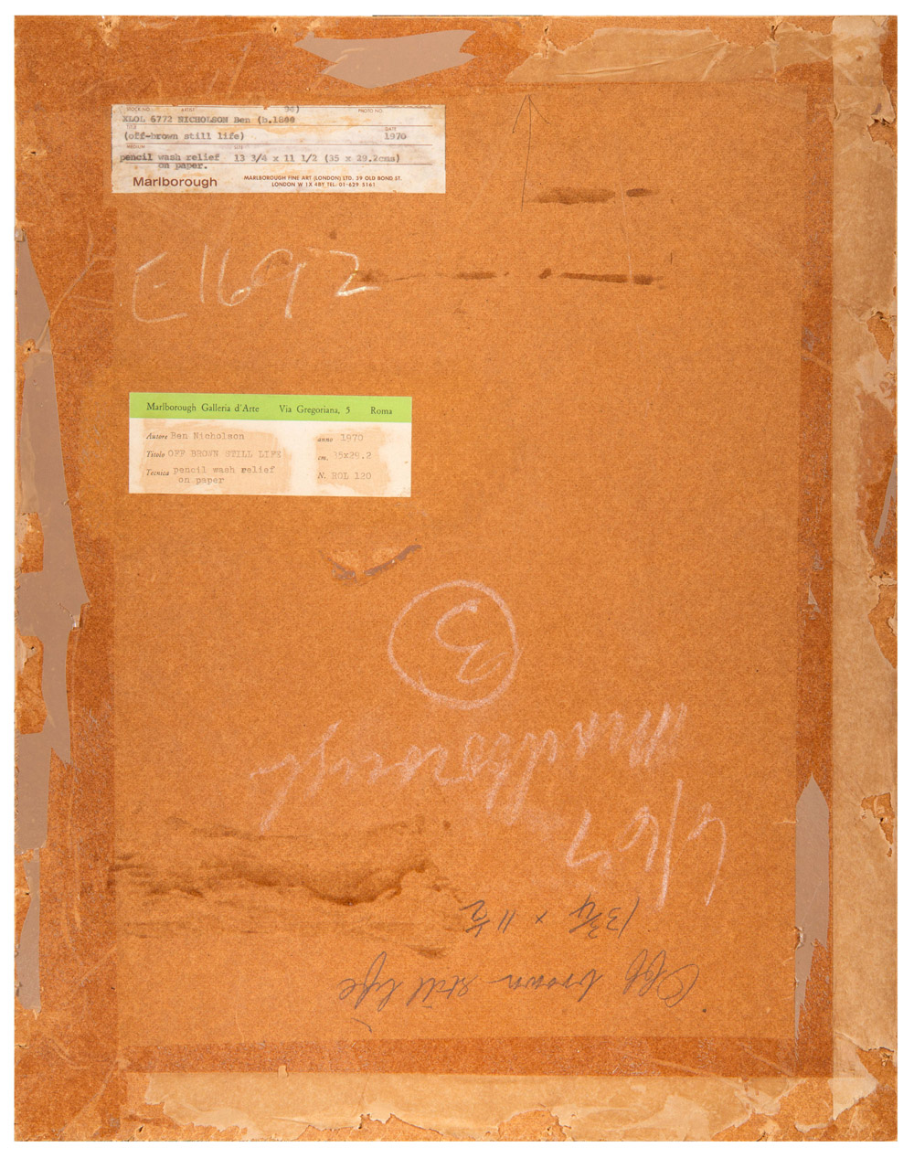 BEN NICHOLSON Denham 1894 - Hampstead 1982 Off-brown still life, 1970 matita e wash relief su carta cm 35 x 29,2 Firma, data e titolo al retro Provenienza Marlborough Fine Art, London. Etichetta al retro Marlborough Galleria d'Arte, Roma. Etichetta al