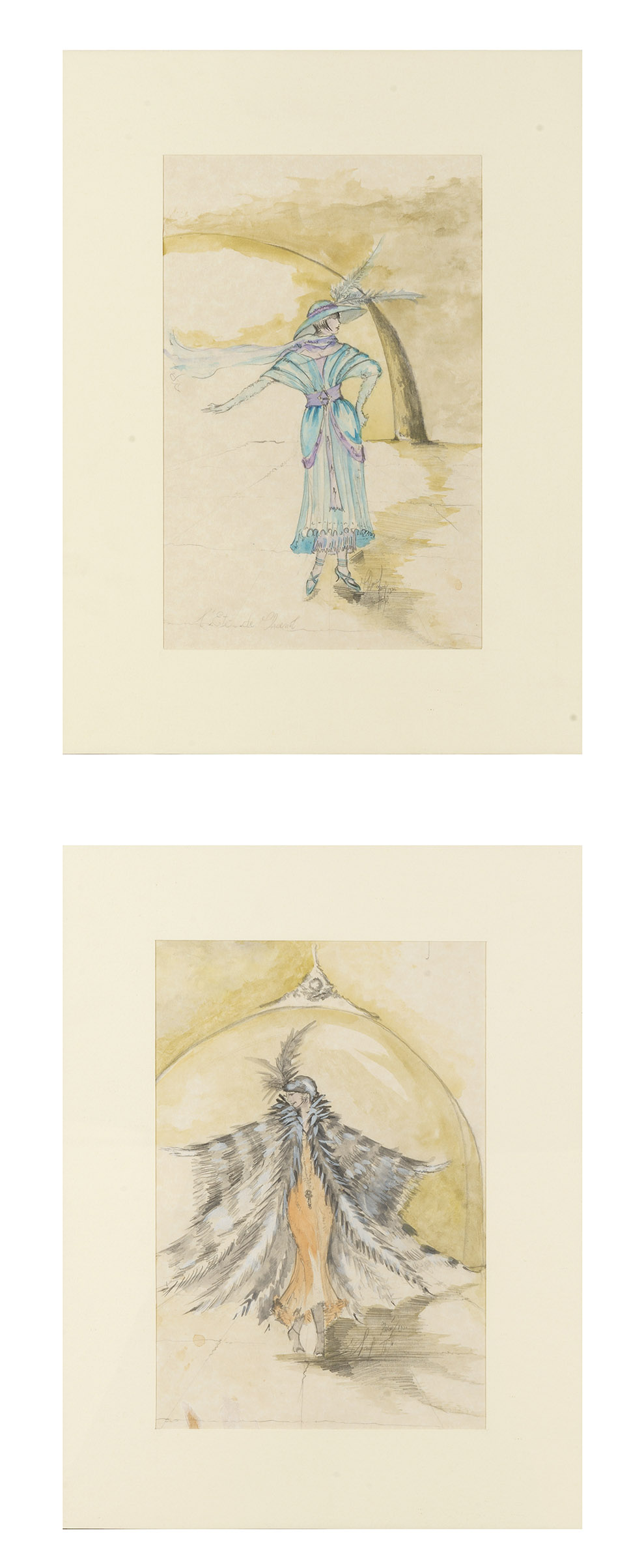 DISEGNI DI MODA DEL XX SECOLO Donna con vestito da sera Donna con vestiro da sera Coppia di tecniche miste su carta cm 40 x 30 Firmate Chanel in basso