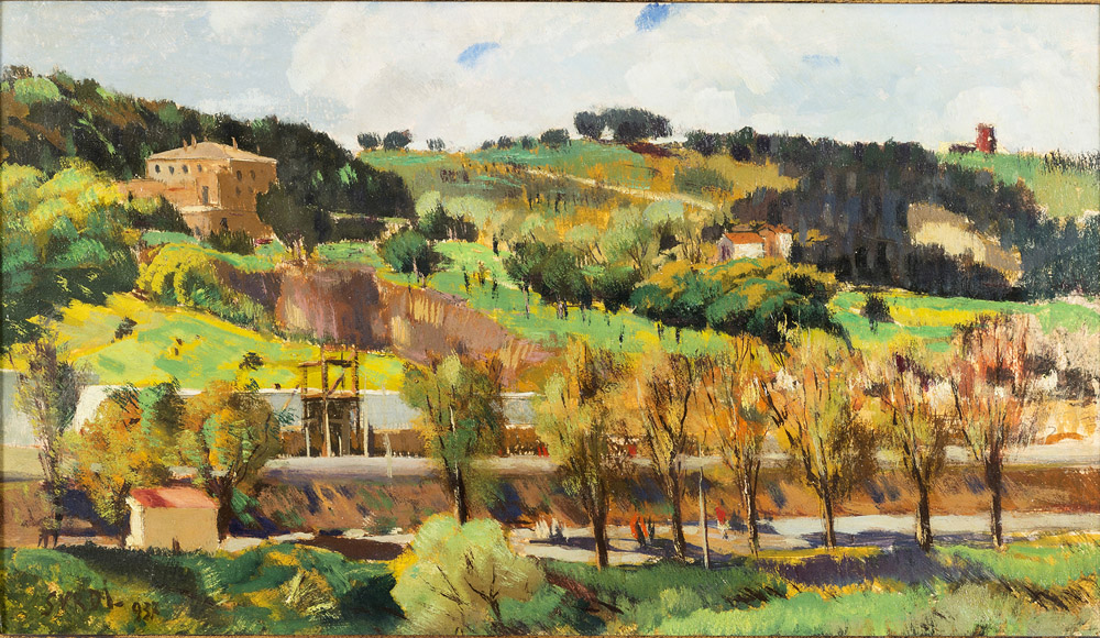 LUIGI SURDI Napoli 1897 - Roma 1959 Monte Mario, 1937 Olio su tavoletta cm 40 x 70 Firma e data in basso a sinistra