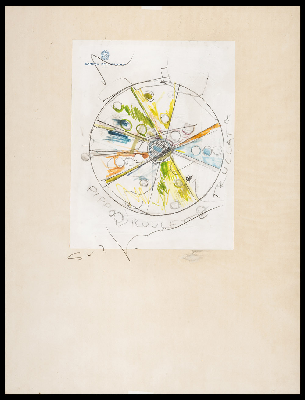 MARIO SCHIFANO Homs 1934- Roma 1998 Pippo roulette truccata Tecnica mista su carta intestata 'camera dei deputati' cm. 52 x 40 Firma ie titolo n basso