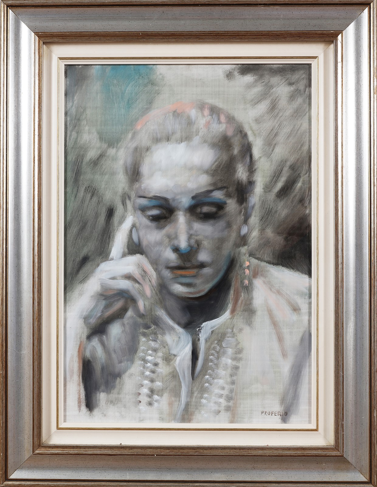 GROSSI PROFERIO (1923 - 2000) Ritratto femminile. Olio su tela. Cm 35,00 x 50,00. Firma in basso a destra. Al retro cartiglio biografico dell'artista. Cornice presente