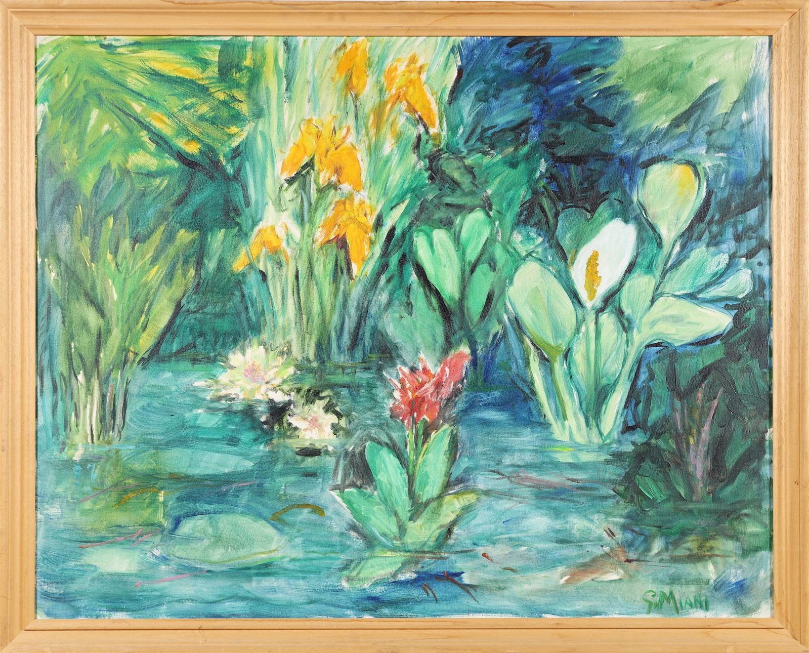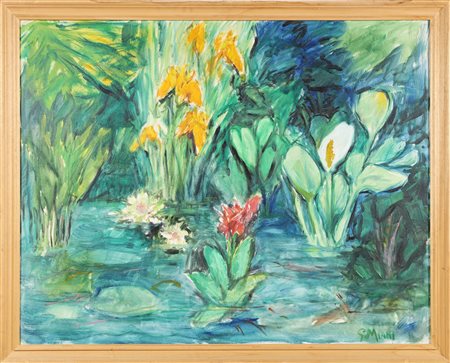 MIANI GAETANO (1920 - 1992) Ninfee e gigli d'acqua. Olio su tela. Cm 100,00 x 80,00. Firma in basso a destra. Al retro: firma e titolo. Cornice presente