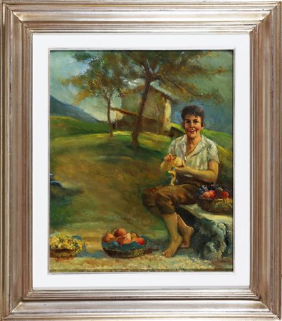 MALDARELLI GIUSEPPE (1885 - 1958) Ragazzo di campagna. Olio su tavola. Cm 50,00 x 60,00. Firma in basso a sinistra. Al retro: cartiglio biografico a cura della Galleria d'Arte Moderna Arisi, Piacenza. Cornice presente