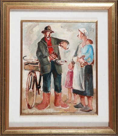 BRAMBATI LUIGI (1925 - 1983) Personaggi. Olio su tavola. Cm 33,00 x 40,00. Firma in basso al centro. . Cornice presente