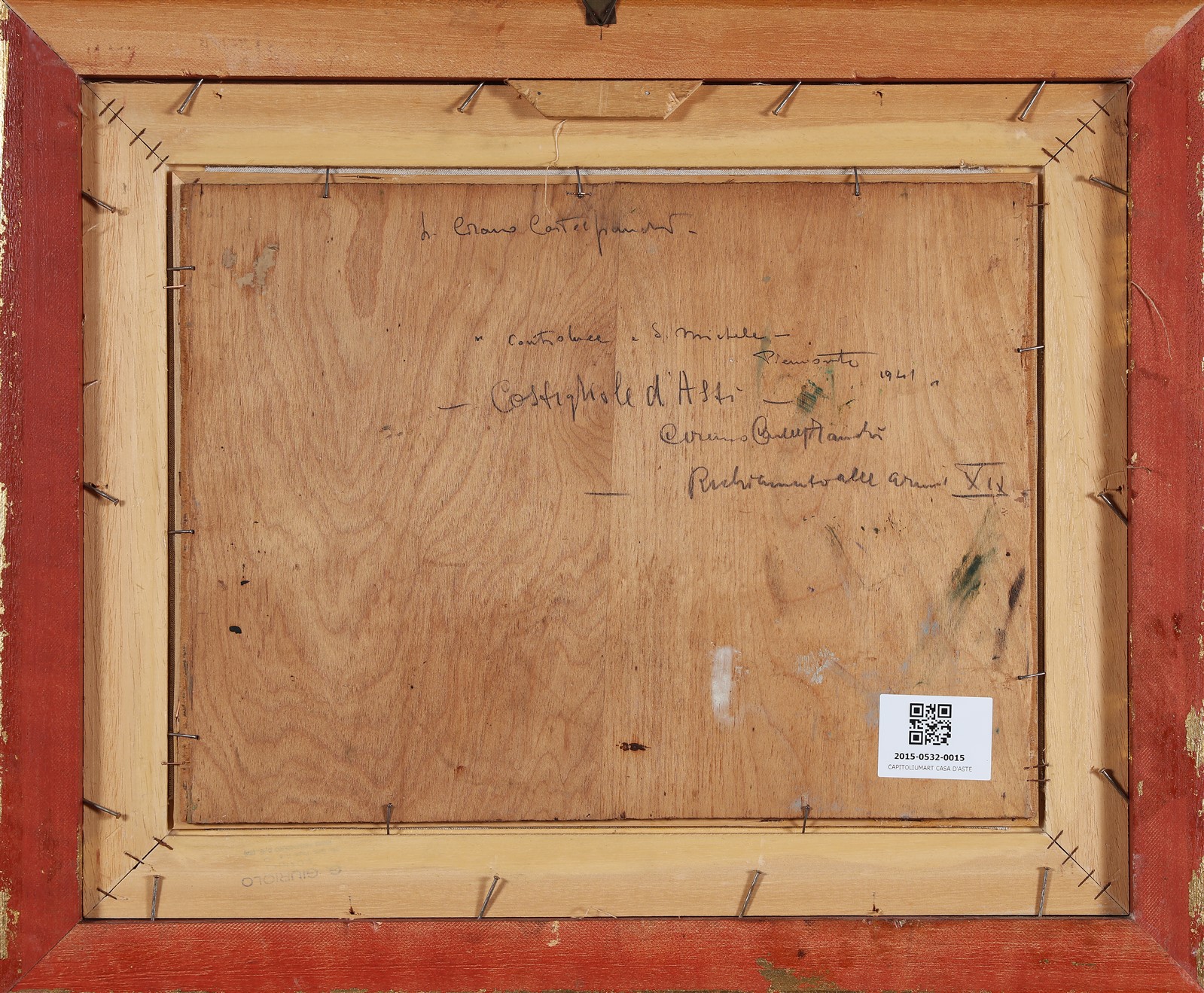 CASTELFRANCHI CIRANO (n. 1912) Controluce a San Michele Piemonte. 1941. Olio su tavola. Cm 40,00 x 30,00. Firma e anno in basso a sinistra. Al retro: firma, titolo e anno. Cornice presente