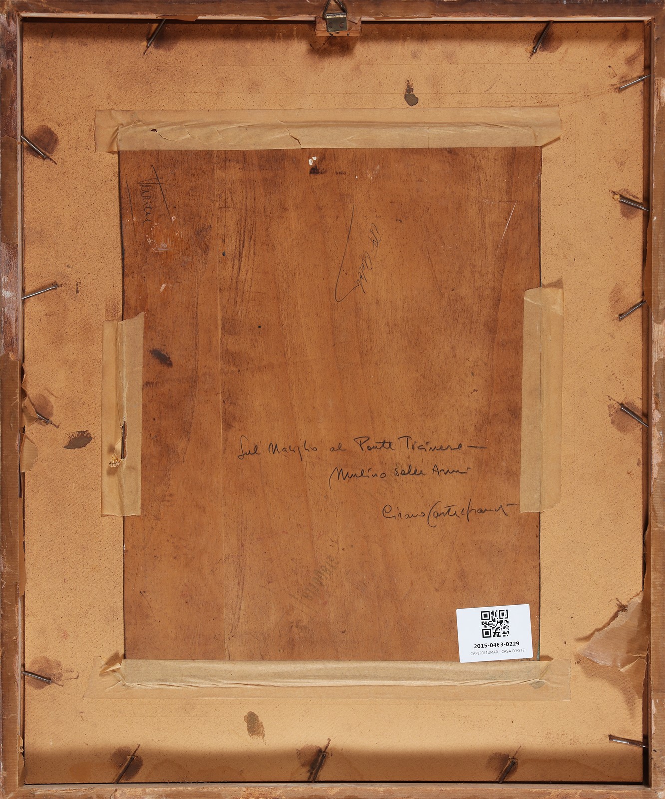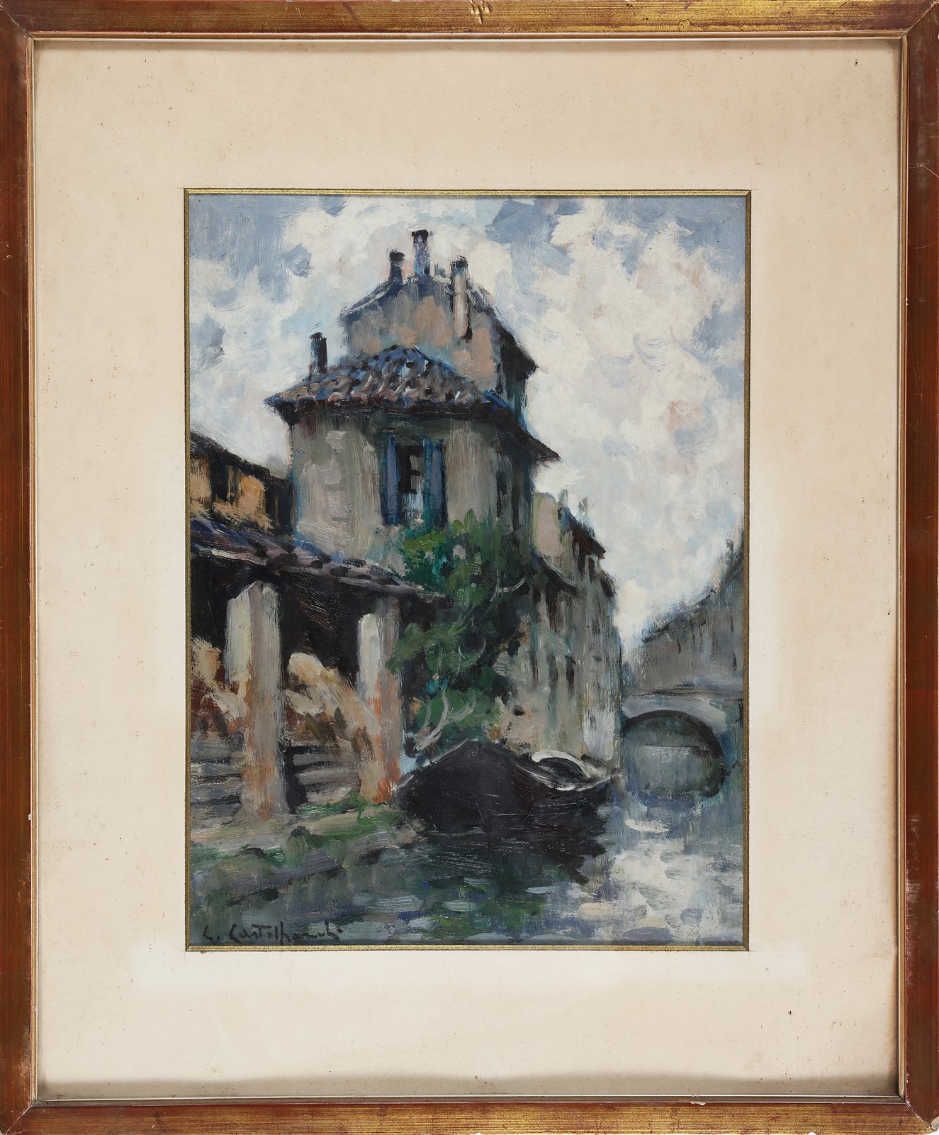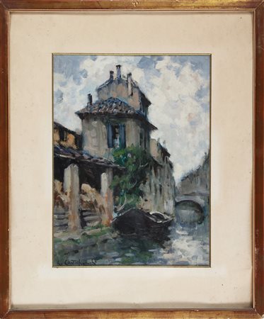 CASTELFRANCHI CIRANO (n. 1912) Naviglio milanese. Olio su compensato. Cm 30,00 x 40,00. Firma in basso a sinistra. Cornice presente