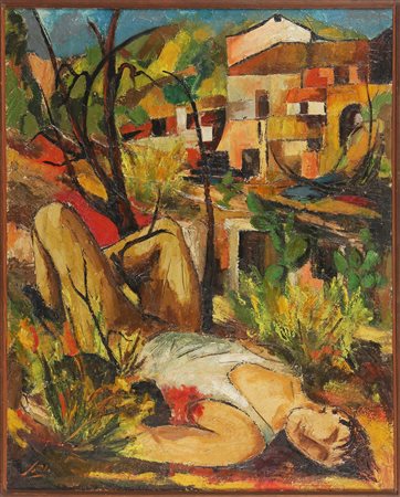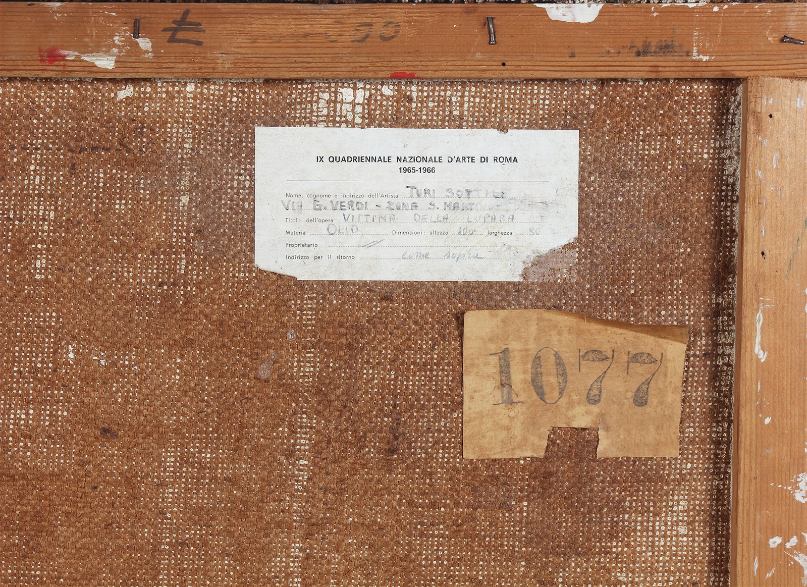 SOTTILE TURI (n. 1936) Vittima della lupara. Olio su tela . Cm 80,00 x 100,00. Firmato in basso a sinistra. Al retro cartiglio della IX Triennale di Roma 1965-1966.