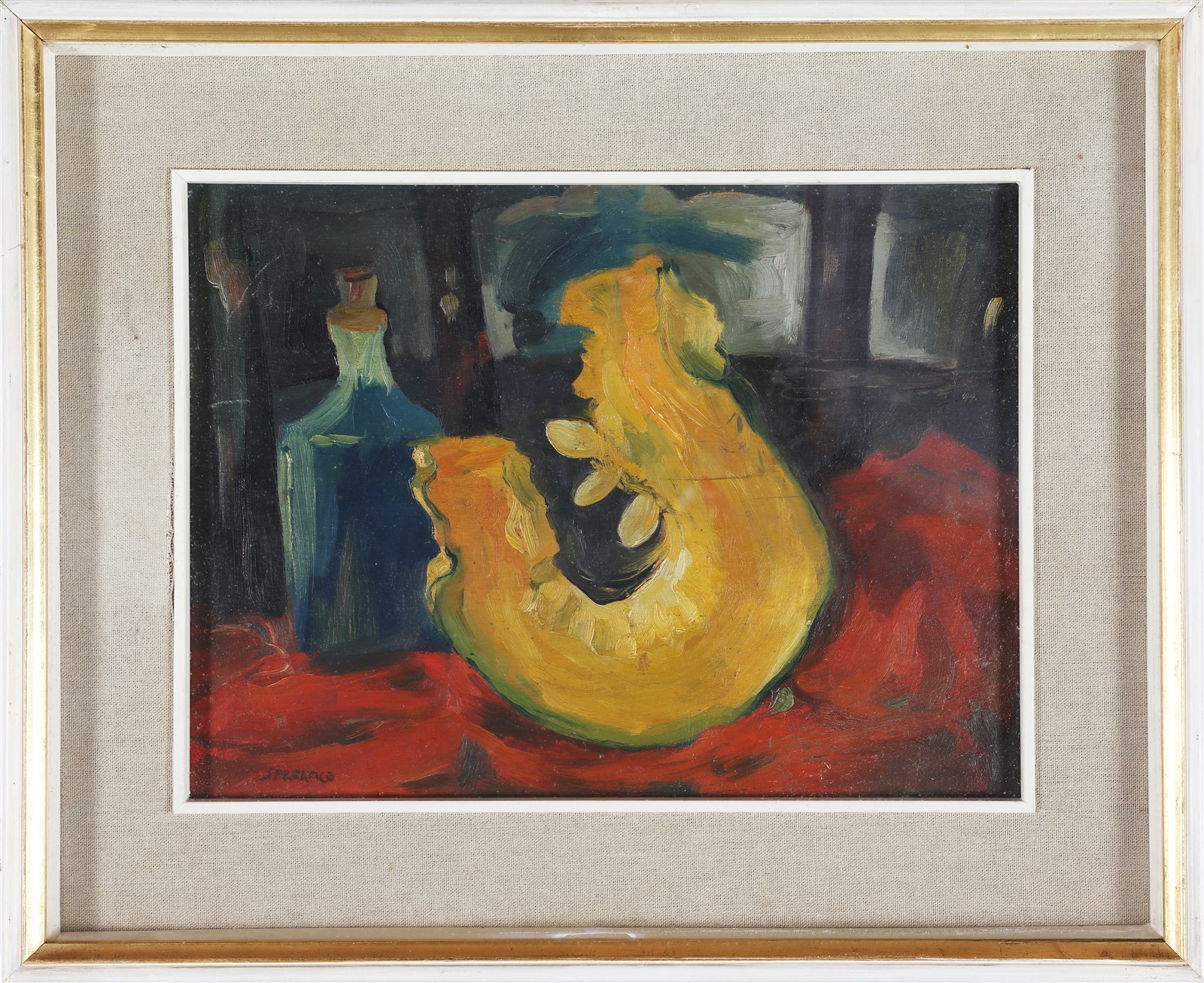 SPREAFICO LEONARDO (1907 - 1974) Natura morta. 1945. Olio su tavola. Cm 40,00 x 30,00. Firma in basso a sinistra. Al retro cartiglio descrittivo a cura della Galleria Ferrari, Treviglio. Cornice presente