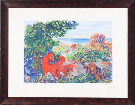 SASSU ALIGI (1912 - 2000) Cavalli. Acquaforte. Cm 86,00 x 64,00. 92/100. Tiratura e firma a matita in basso. Dimensione lastra: 45x63cm. . Cornice presente