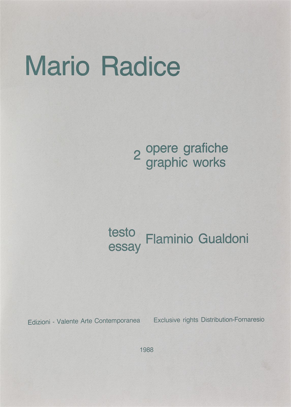 RADICE MARIO (1898 - 1987) Mauro Radice (cartella). 1988. Serigrafia. Cm 50,00 x 70,00. Cartella completa contenente n.2 serigrafie firmate e numerate dall'autore a matita. Tiratura: 100 + XXX. Edizioni Valente Arte Contemporanea, con testi di Flaminio Gualdoni. Confezione originale numerata. Esemplare: