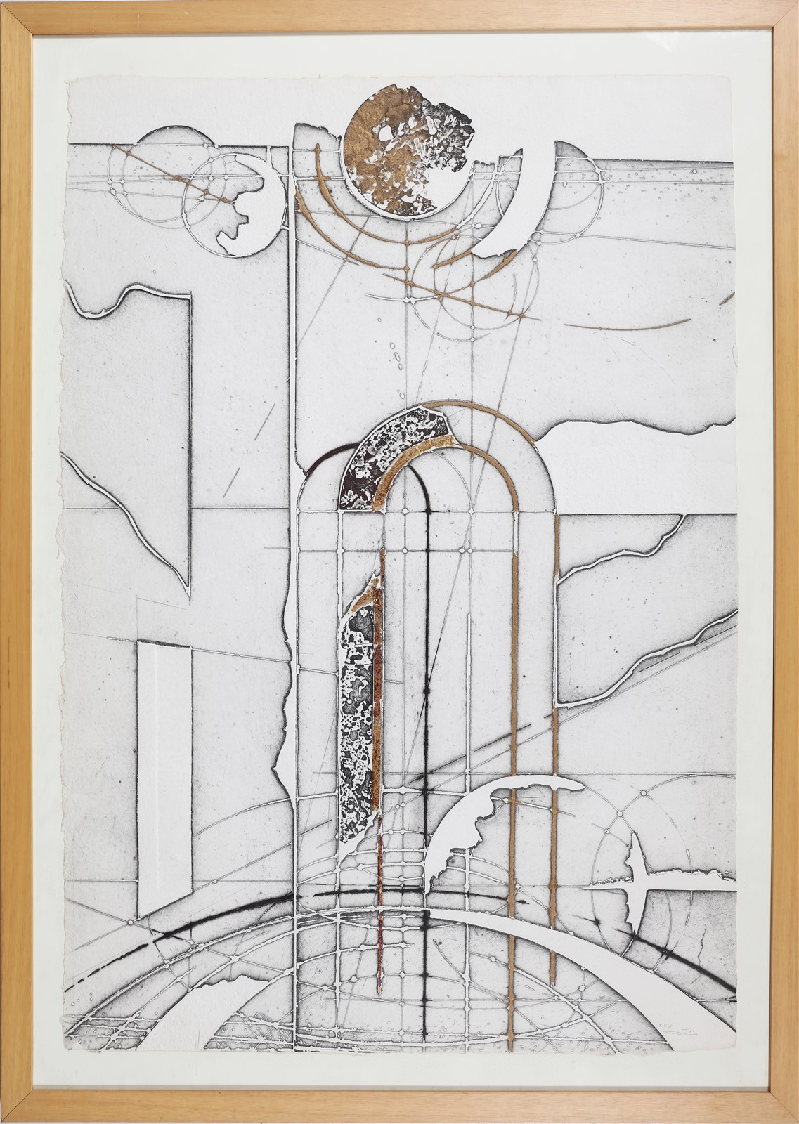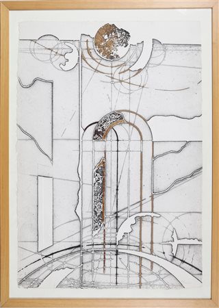 VALENTINI WALTER (n. 1928) Senza titolo. Calcografia. Cm 62,00 x 91,00. Multiplo. XIX. Tiratura, firma e timbro a secco in basso a destra. Al retro timbro a cura della Galleria Ferrari, Treviglio. Cornice presente