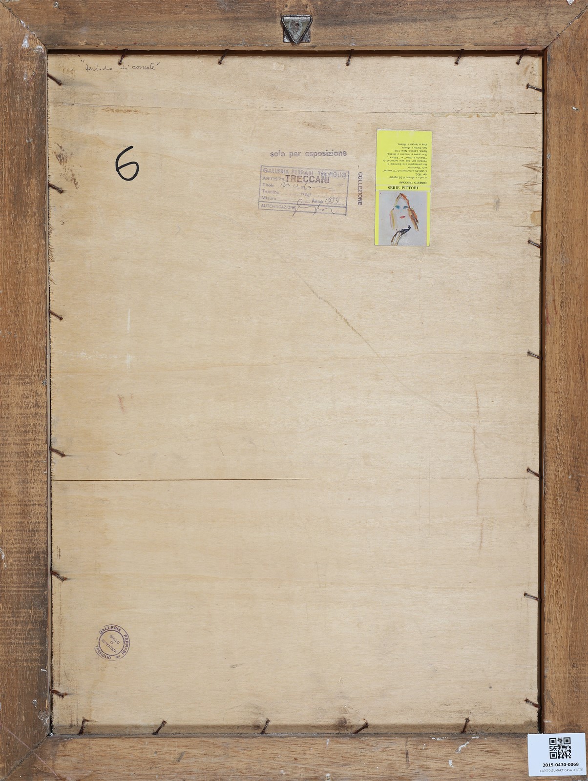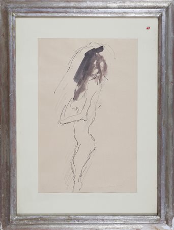 TRECCANI ERNESTO (1920 - 2009) Senza titolo. 1954. Tecnica mista su carta. Cm 31,00 x 47,50. Firma in basso a destra. Al retro timbro descrittivo della Galleria Ferrari, Treviglio. Cornice presente