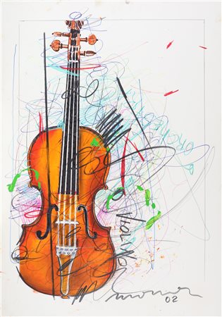 MANERA ENRICO (n. 1947) Violino. 2002. Tecnica mista su cartone. Cm 70,00 x 100,00. Firma e anno in basso a destra. Autentica dell'artista su fotografia.
