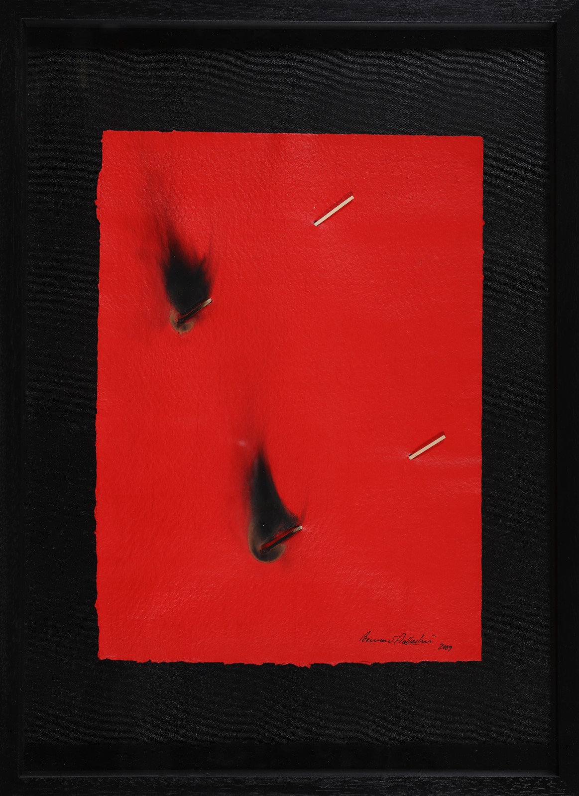 AUBERTIN BERNARD (n. 1934) Papier Rouge Brulé. 2009. Fiammiferi bruciati su carta. Cm 35,00 x 50,00. Firma e anno in basso a destra. Autentica dell'artista su fotografia a cura dell'Archivio Nordest, Seregno riportante il relativo numero d'inventario. Cornice presente