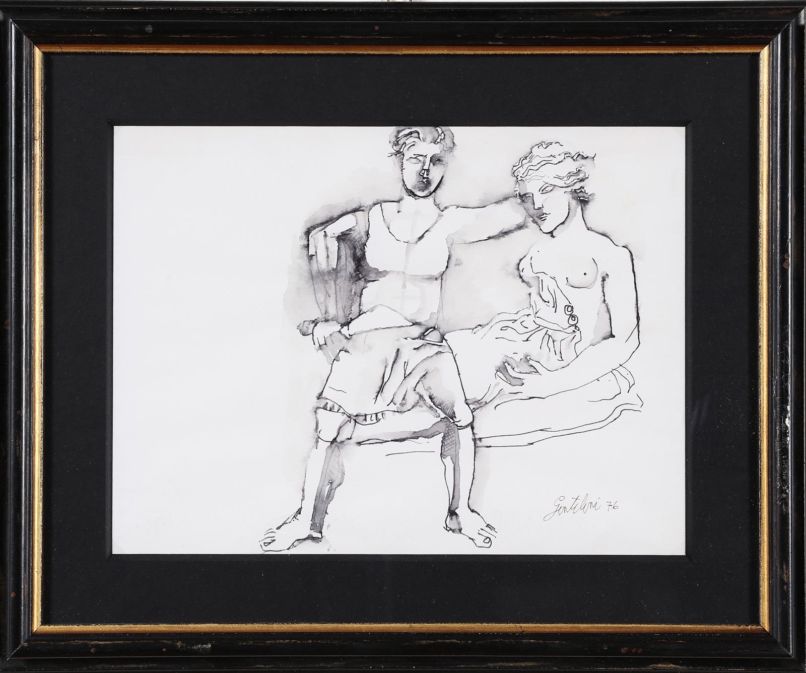 GENTILINI FRANCO (1909 - 1981) Figure. 1976. China su carta. Cm 30,00 x 24,00. Firma e anno in basso a destra. Cornice presente