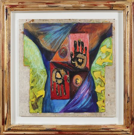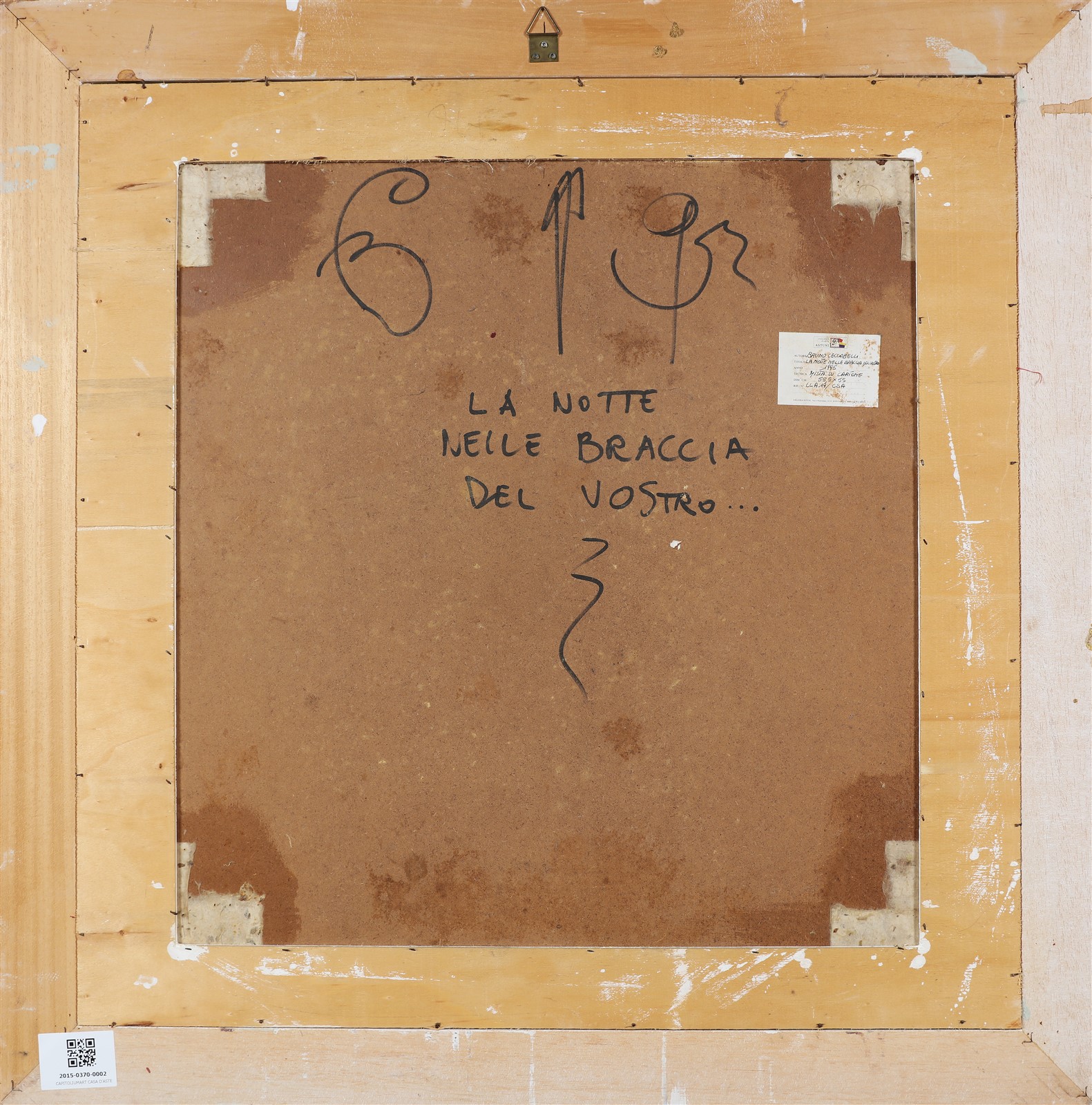 CECCOBELLI BRUNO (n. 1952) La notte nelle braccia del vostro... 1995. Tecnica mista su cartone. Cm 55,00 x 55,50. Al retro titolo e cartiglio descrittivo a cura della Galleria d'Arte Astuni, Fano. Autentica su fotografia a cura della Galleria d'Arte Astuni, Fano con relativo numero d'inventario. Cornice presente