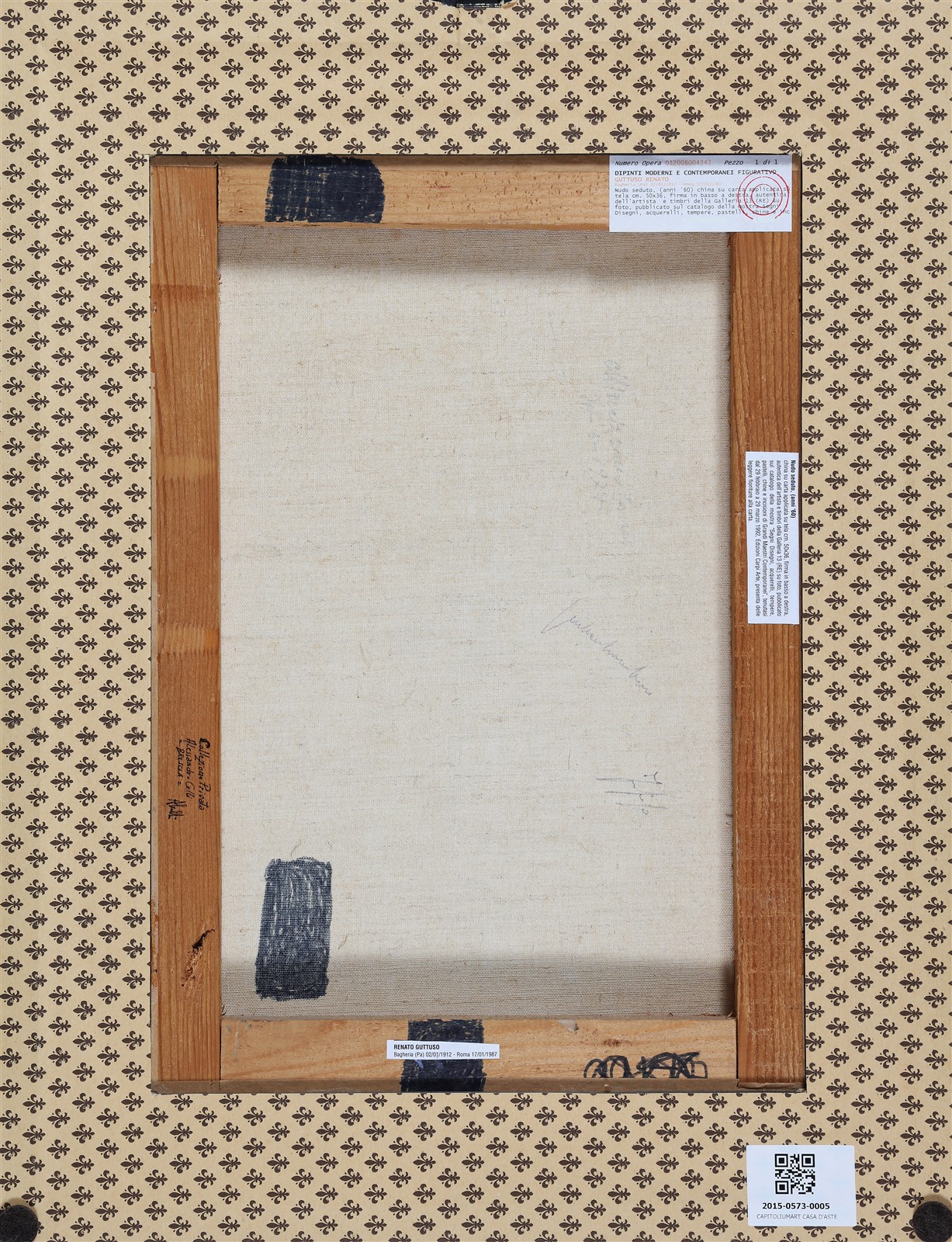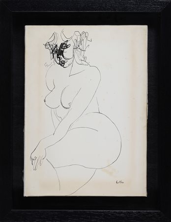 GUTTUSO RENATO (1912 - 1987) Nudo seduto. China su carta su tela. Cm 36,00 x 50,00. Anni '60. Firma in basso a destra. Autentica dell'artista su fotografia. Certificato di autenticità e provenienza a cura della Casa d'Aste Meeting Art, Vercelli.Pubblicazioni: catalogo della mostra Segni, disegni, acquerelli, tempere, pastelli, chine e incisioni di Grandi Maestri Contemporanei, 29 Febbraio - 29 Marzo, 1992, presso la Galleria Carpi Arte. Cornice presente