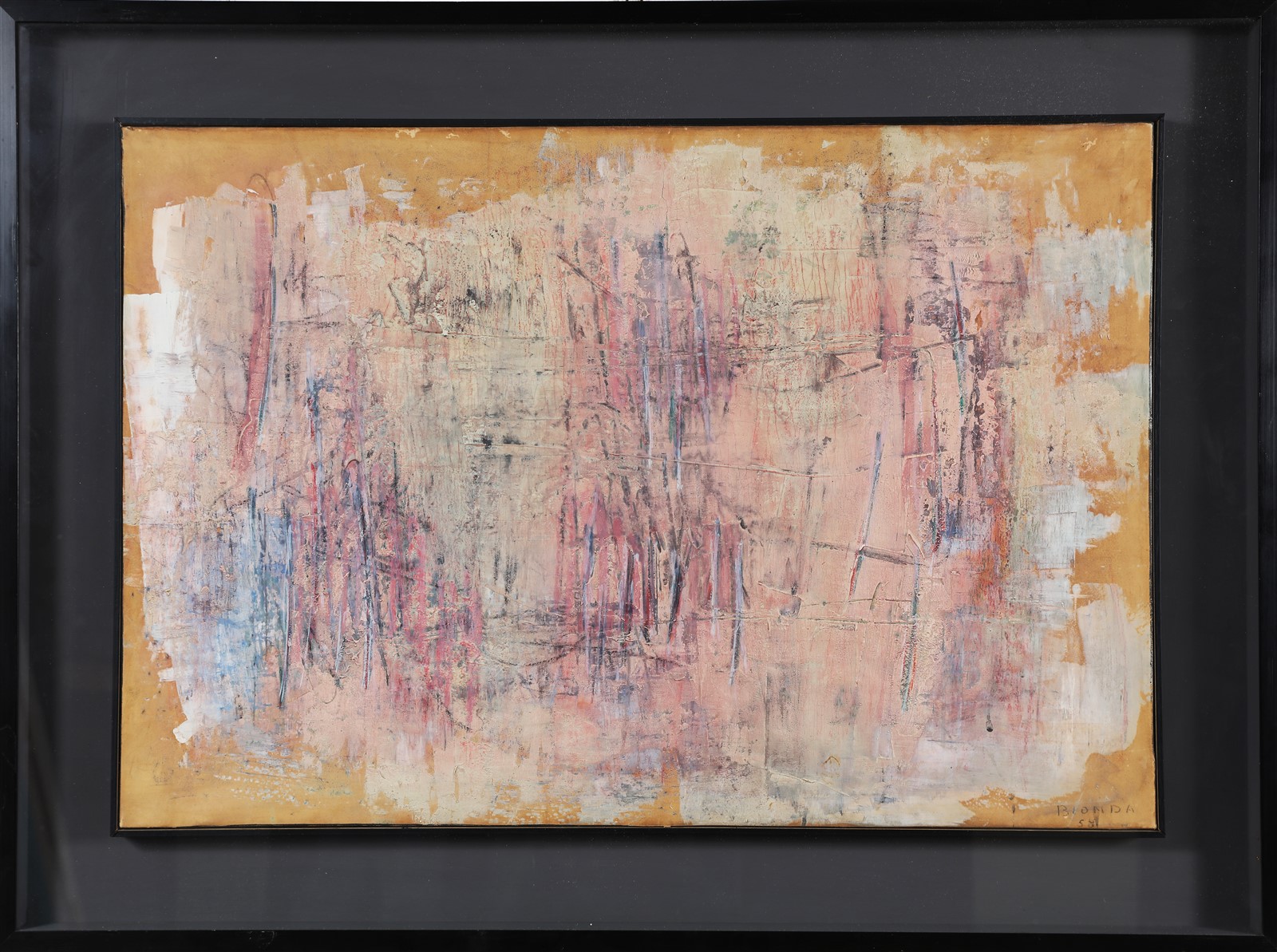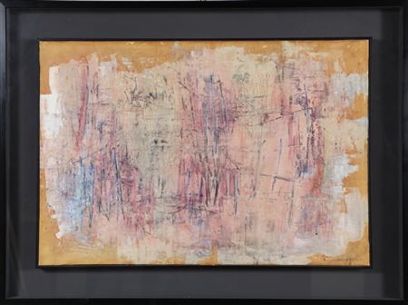 BIONDA MARIO (1913 - 1985) Senza titolo. 1958. Polimaterico su carta applicata su tela. Cm 70,00 x 47,00. Firma e anno in basso a destra. Autentica su fotografia a cura dell'Archivio Generale delle Opere di Mario Bionda, Milano riportante il relativo numero d'inventario. Autentica su fotografia a cura della Galleria d'Arte Moderna Lo Spazio, Brescia.