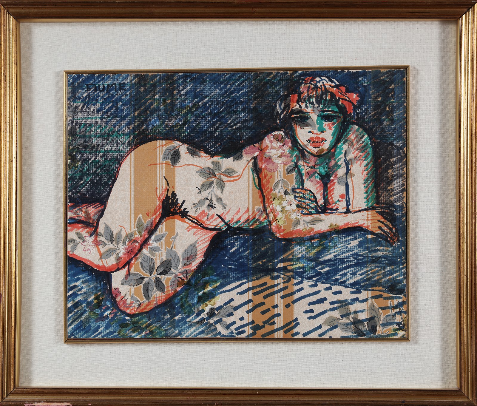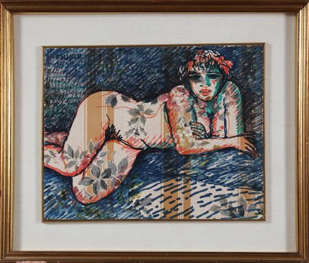 FIUME SALVATORE (1915 - 1997) Ragazza sdraiata. Acrilico su carta incollata su tavola. Cm 50,00 x 40,00. Firma in alto a sinistra. Anni '80. Autentica su fotografia a cura di Luciano Fiume. Pubblicazione: Opera pubblicata sul Catalogo Generale delle opere di Salvatore Fiume, Vol. II, Téchbe Editore, Pag. 135. Cornice presente