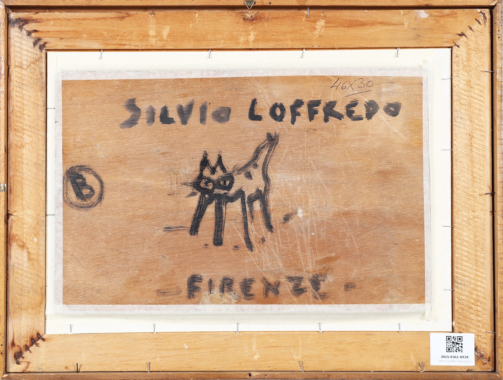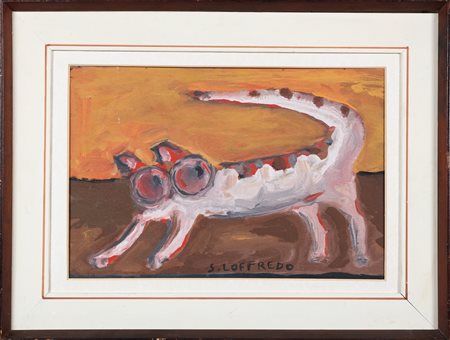 LOFFREDO SILVIO (n. 1921) Gatto. Olio su tavola. Cm 47,00 x 30,00. Firma in basso al centro e al retro. Autentica dell'artista su fotografia. Cornice presente